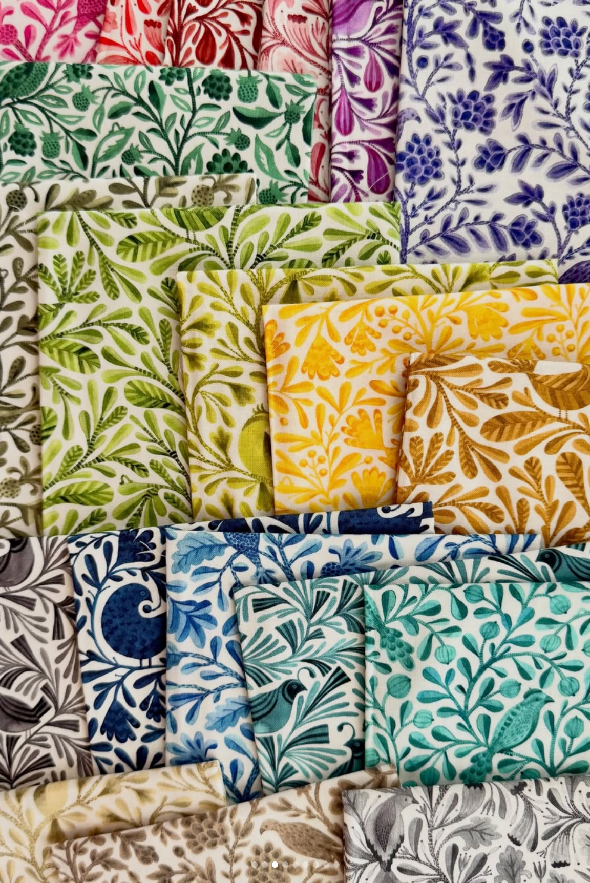 Kirsten Sevig has a fine organic batiste collection with Cloud 9 that was also released April 2018 called Elliot Avenue. It's a series of 8 patterns in blacks and blues. Each pattern in this collection is named for one of the colorful characters who helped make this street home. Check it out here! She also created a rainbow quilting cotton collection called Birds & Branches that was expanded and re-released December 2025! Find it here!